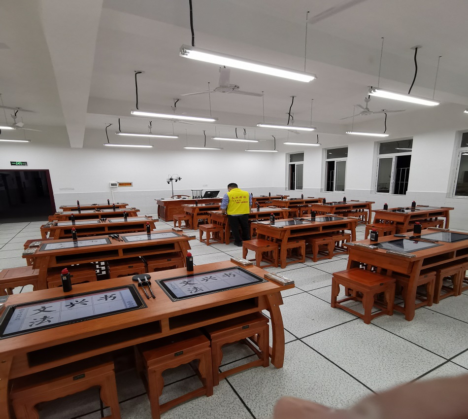 本系統(tǒng)采購40座為/間書法教室,書法桌采用實木清明古典風格,兩人一桌,規(guī)格為:140*60*75(長*寬*高)。實木結(jié)實牢固,漆面平整光亮,一桌兩凳,規(guī)格為35*30*45(長*寬*高)整體風格為明清古典。