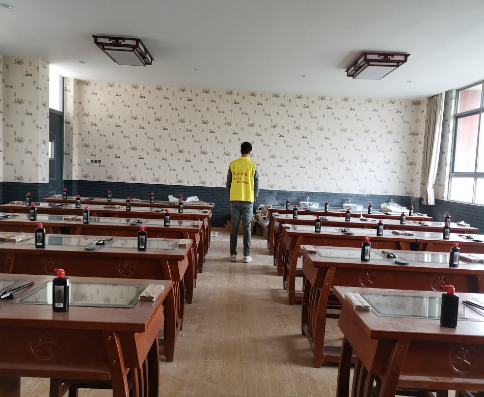 本系統(tǒng)采購48座為/間書法教室,書法桌采用實木清明古典風格,兩人一桌,規(guī)格為:140*60*75(長*寬*高)。實木結(jié)實牢固,漆面平整光亮,一桌兩凳,規(guī)格為35*30*45(長*寬*高)整體風格為明清古典。