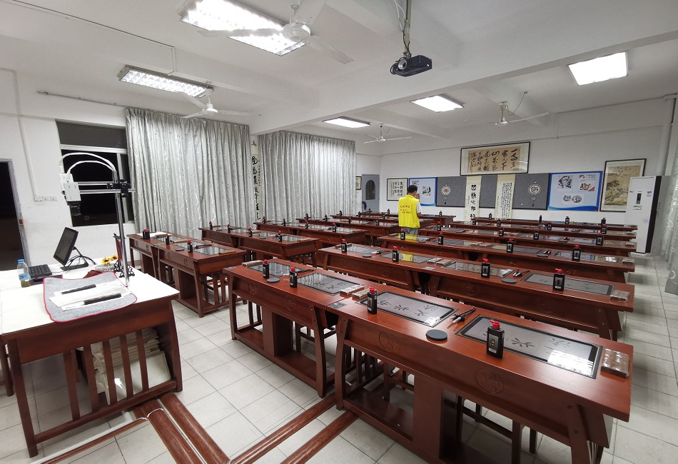 本套方案采用沙畫室40位為/間。書法教室48位為/間,書法教室桌子規(guī)格為:140*60*75(長*寬*高)。實(shí)木材質(zhì),漆面平整光亮,一桌兩凳,整體風(fēng)格為明清古典。