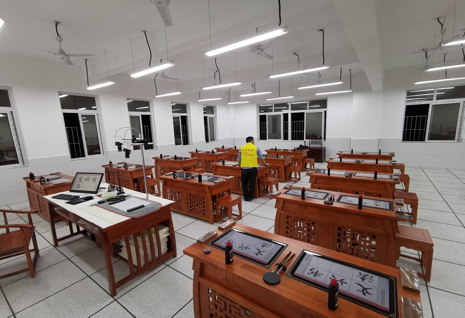 本系統(tǒng)采購36座為/間書法教室,書法桌采用實木清明古典風格,兩人一桌,規(guī)格為:140*60*75(長*寬*高)。實木結(jié)實牢固,漆面平整光亮,一桌兩凳,規(guī)格為35*30*45(長*寬*高)整體風格為明清古典。