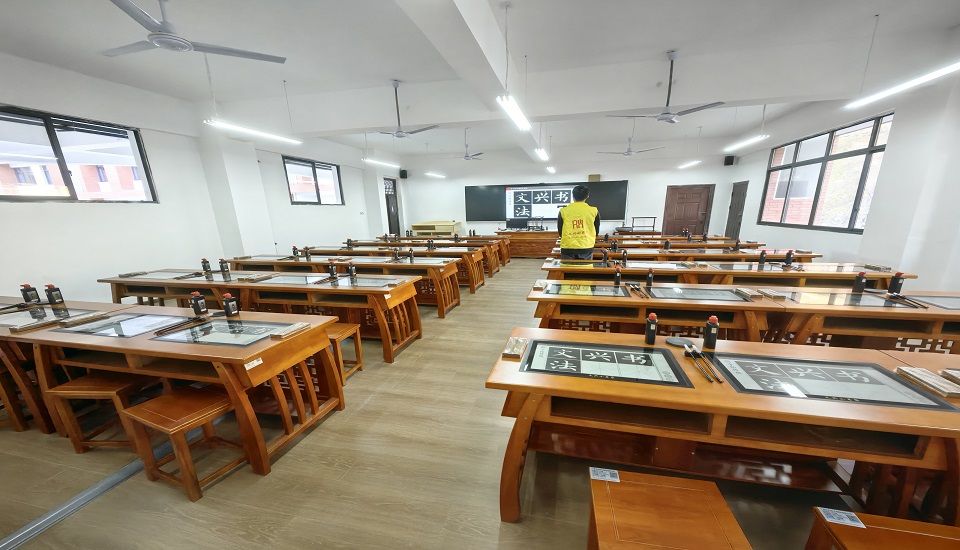 本套方案采用48位/間智慧書法教室,書法桌采用實木、清明古典風(fēng)格,兩人一桌,規(guī)格為:140*60*75(長*寬*高)。漆面平整光亮,凳子規(guī)格35*30*45(長*寬*高)。